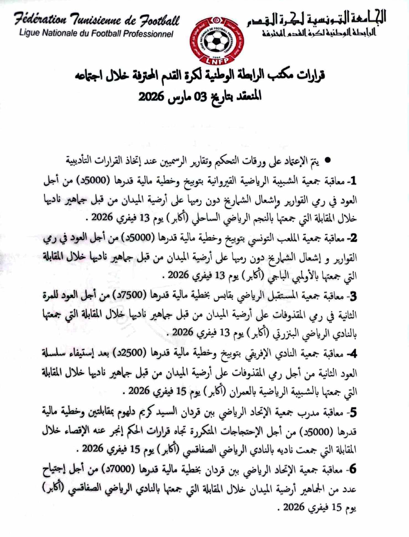 عقد مكتب الرابطة الوطنية لكرة القدم المحترفة مساء أمس الثلاثاء 3 مارس 2026 اجتماعه الدوري الأول بعد تنصيبه رسميا واتخذ جملة من القرارات التأديبية